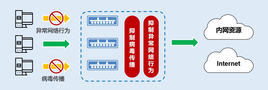 美襄科技LSW3600-SE、LSW5662-SE系列自安全交换机可部署于接入、汇聚等网络位置,支持对接入网络中的终端实施病毒传播行为检测,一旦终端出现疑似病毒传播行为即可快速定位,可天然抵御WannaCry、WannaMine、Petya、BadRabbit等蠕虫病毒在内网的传播扩散。