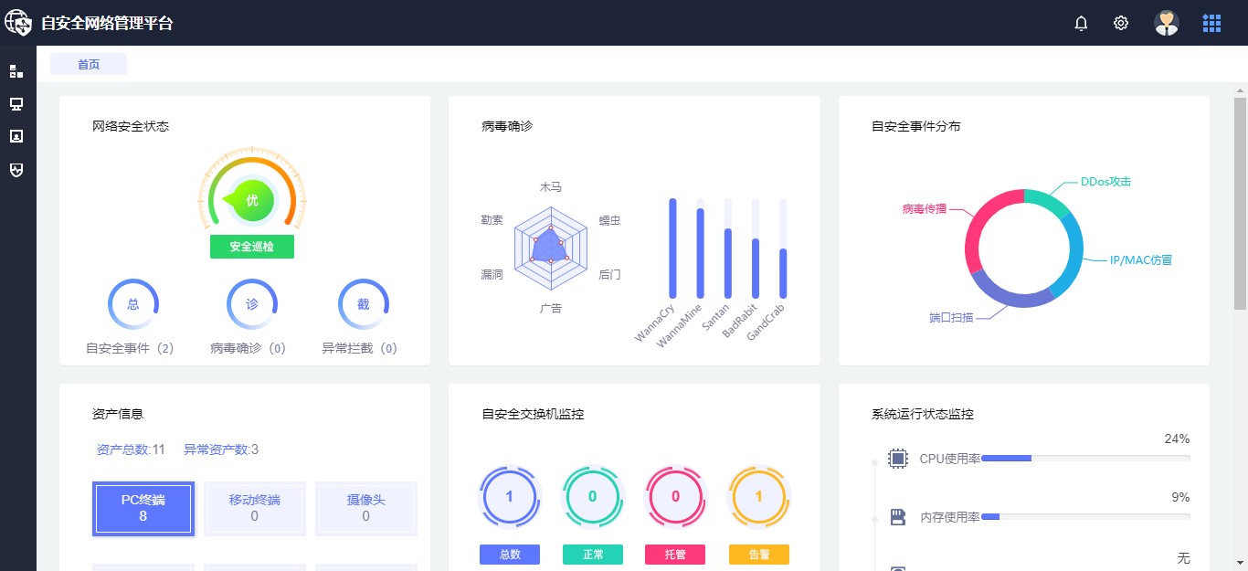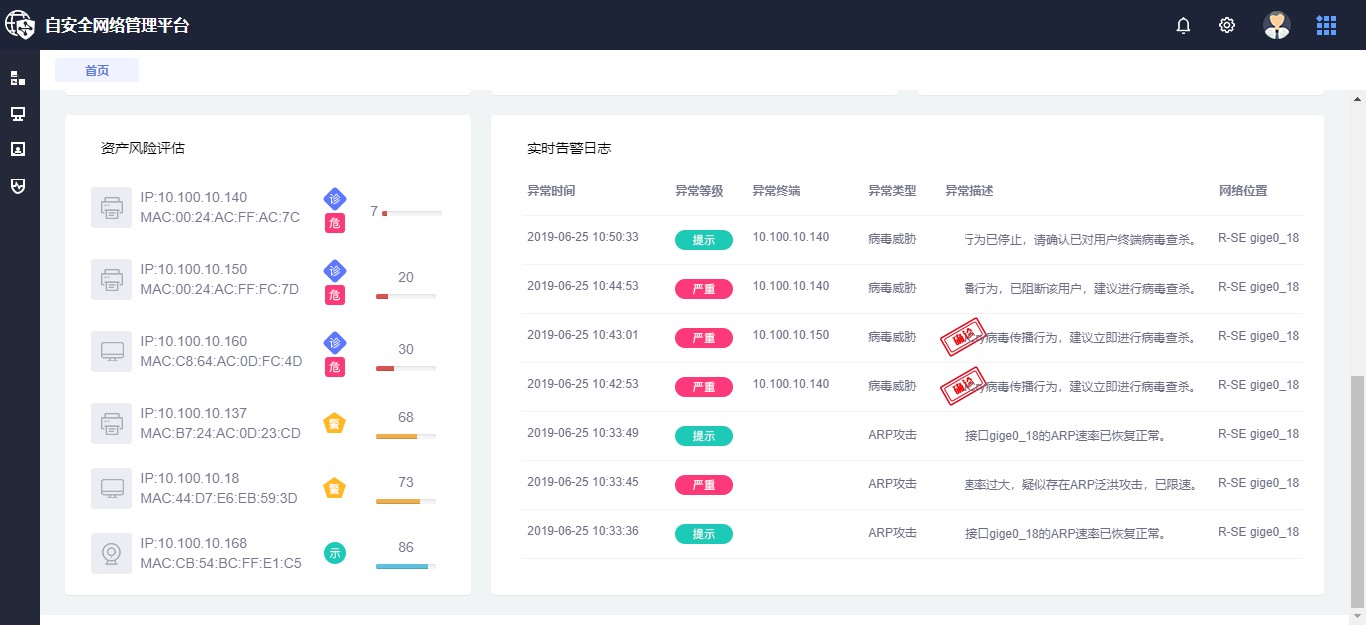 除此之外自安全网络解决方案还为用户提供直观的内网可视化手段,对内网中的病毒威胁、网络攻击、环路异常等常见故障进行溯源、实时追溯威胁发生的网络位置;通过“内网一键运维”模块,用户还可以快速对内网终端及威胁进行自动化排查和处置,保障网络稳定运行。