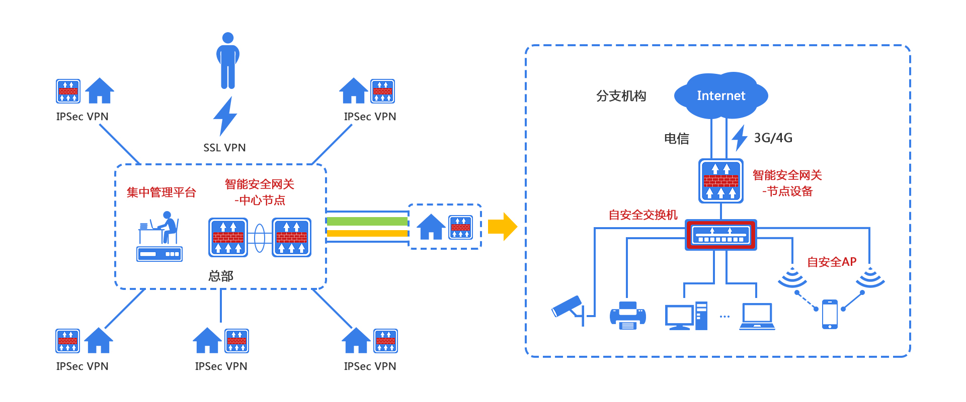 Permalink 自安全分支机构解决方案 互联网的发展,使得企业的工作模式发生了根本性的改变。为了配合业务的拓展,很多企事业单位都会在全国各地设立分支机构,分支和总部有实时的业务交互,IT的建设需求也多种多样。除了安全访问以外,分支机构还和总部一样,存在安全防护、安全合规以及办公网建设等需求。而分支机构往往没有专业的运维人员,这为分支机构的IT建设和运维带来了挑战。自安全分支机构解决方案以VPN1000系列智能安全网关为核心,结合SE系列自安全交换机及无线AP等产品,为用户提供完整的分支机构广域互联解决方案。